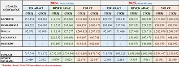 Trakya GDTBM 2024-2025 Yılları Aynı Dönem(1 Ocak -31 Ekim) Tır-Binek Araç-Yolcu Karşılaştırma İstatistikleri