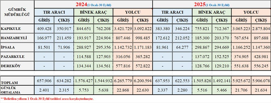 Trakya GDTBM 2024-2025 Yılları Aynı Dönem(1 Ocak -30 Eylül) Tır-Binek Araç-Yolcu Karşılaştırma İstatistikleri