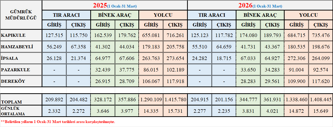 Trakya GDTBM 2025-2026 Yılları Aynı Dönem(1 Ocak -31 Mart) Tır-Binek Araç-Yolcu Karşılaştırma İstatistikleri