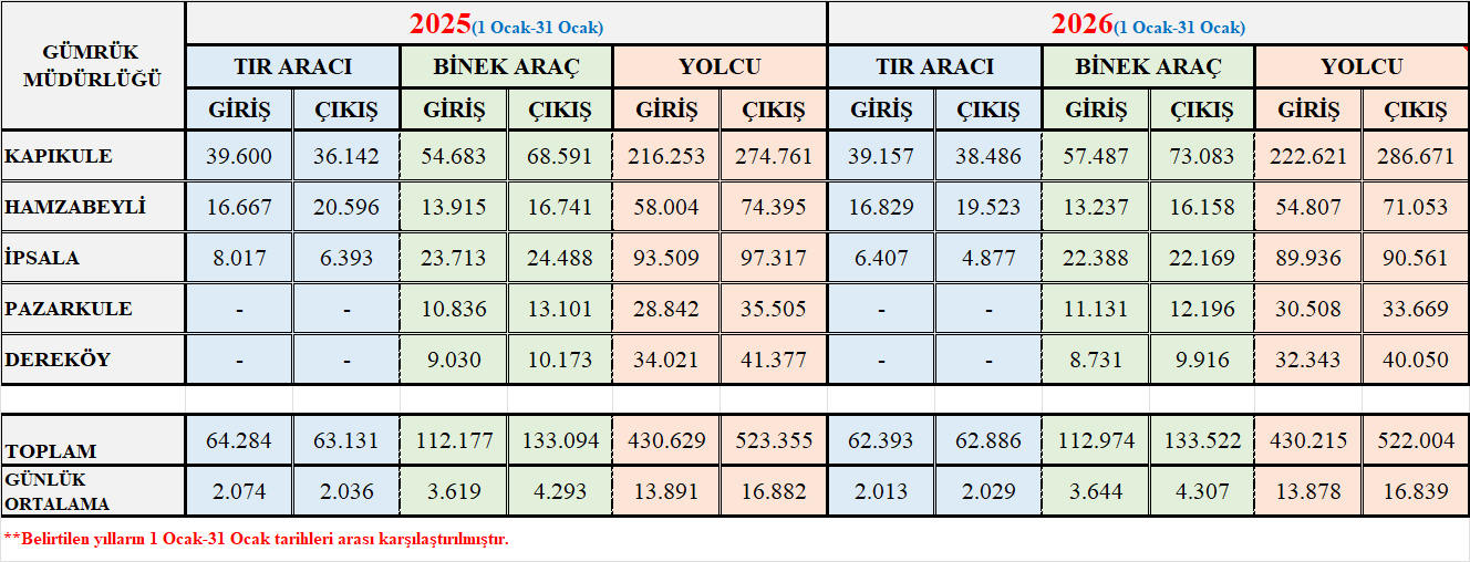Trakya GDTBM 2025-2026 Yılları Aynı Dönem(1 Ocak -31 Ocak) Tır-Binek Araç-Yolcu Karşılaştırma İstatistikleri